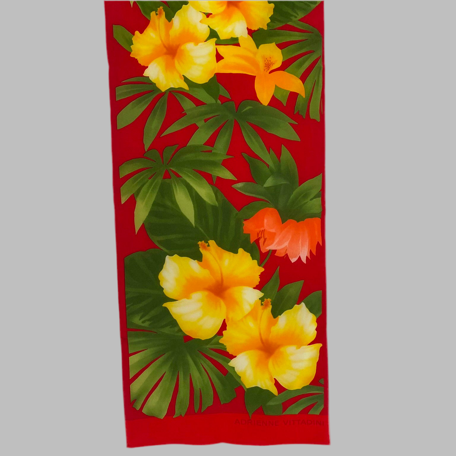 This Adrienne Vittadini silk scarf features floral design in red, green, white, yellow, gold and coral.