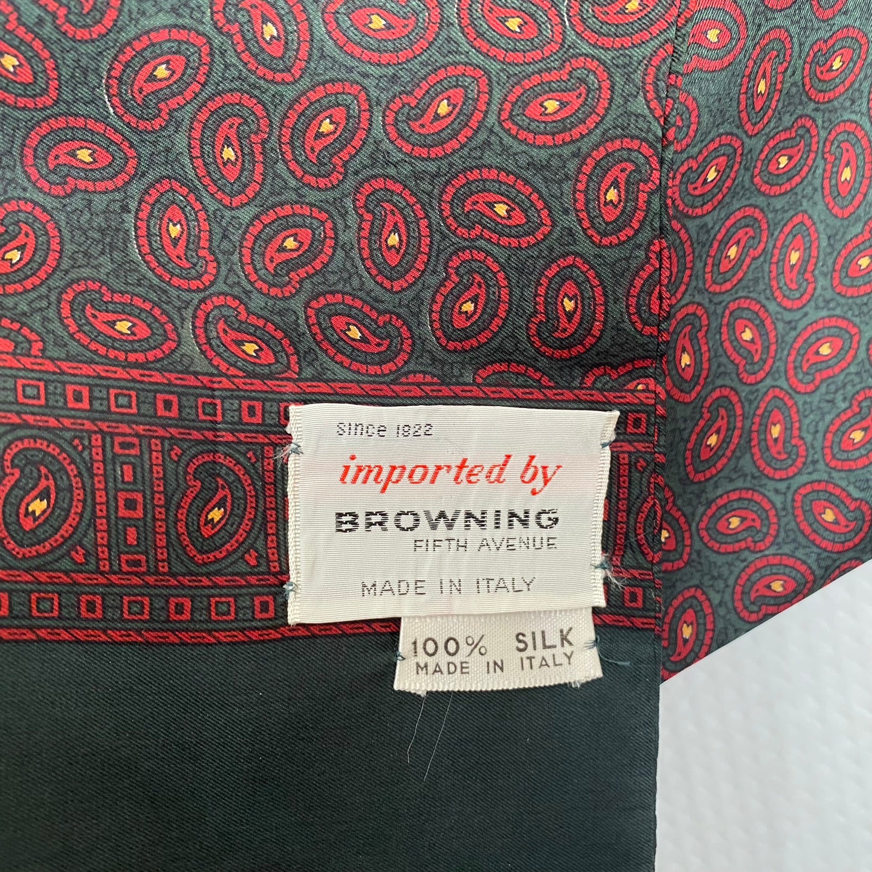 This Browning Fifth Avenue men's silk scarf features paisley design in chestnut, red, green, gold