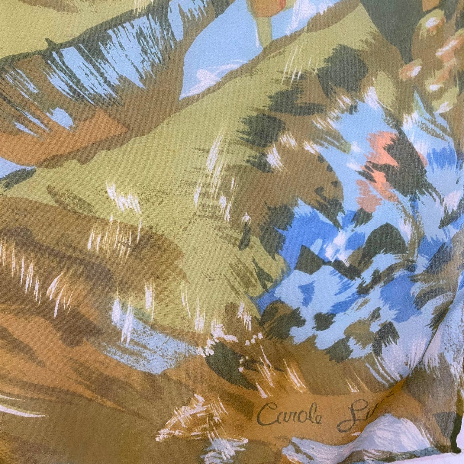 This Carole Little silk scarf features floral design and is lightweight chiffon in green, orange, chestnut, blue.