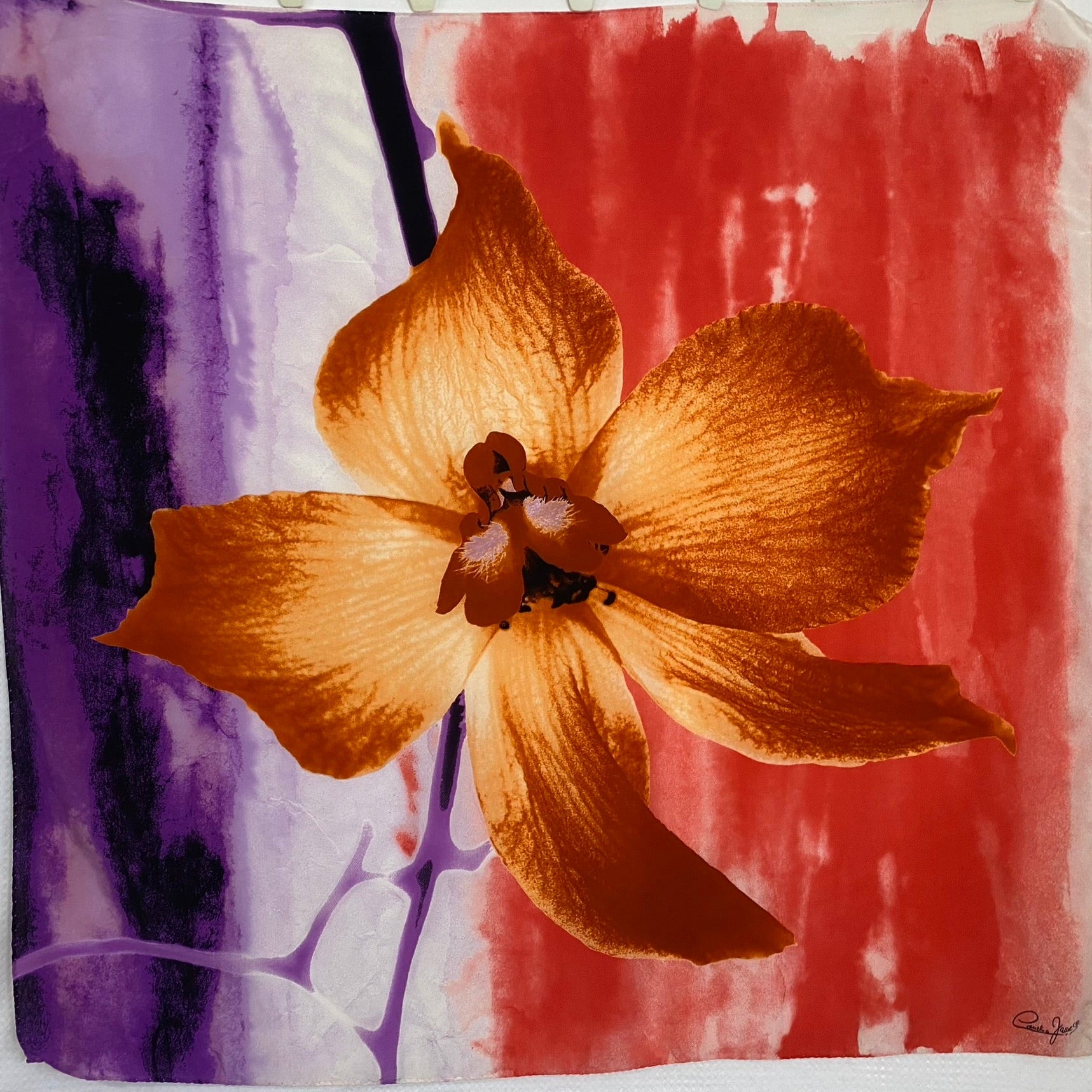 This Cornelia James silk scarf features art floral design in ivory, coral, chestnut and purple.