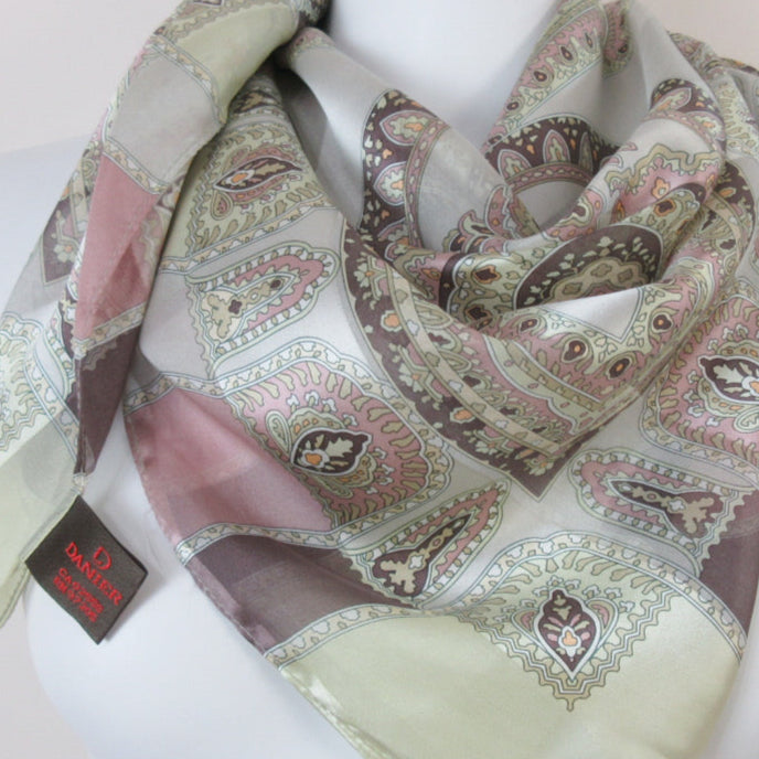 This Danier silk scarf features belle epoque, floral with alternating stripes solid and chiffon and is semi sheer in pink, ivory, green, brown, orange.