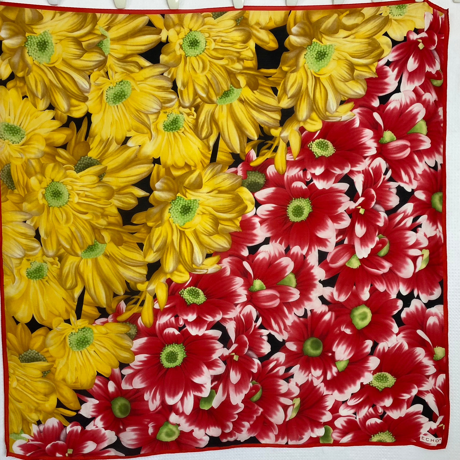 This Echo silk scarf features floral design that changes look depending on how it is folded when worn in red, yellow gold, white, black, green.