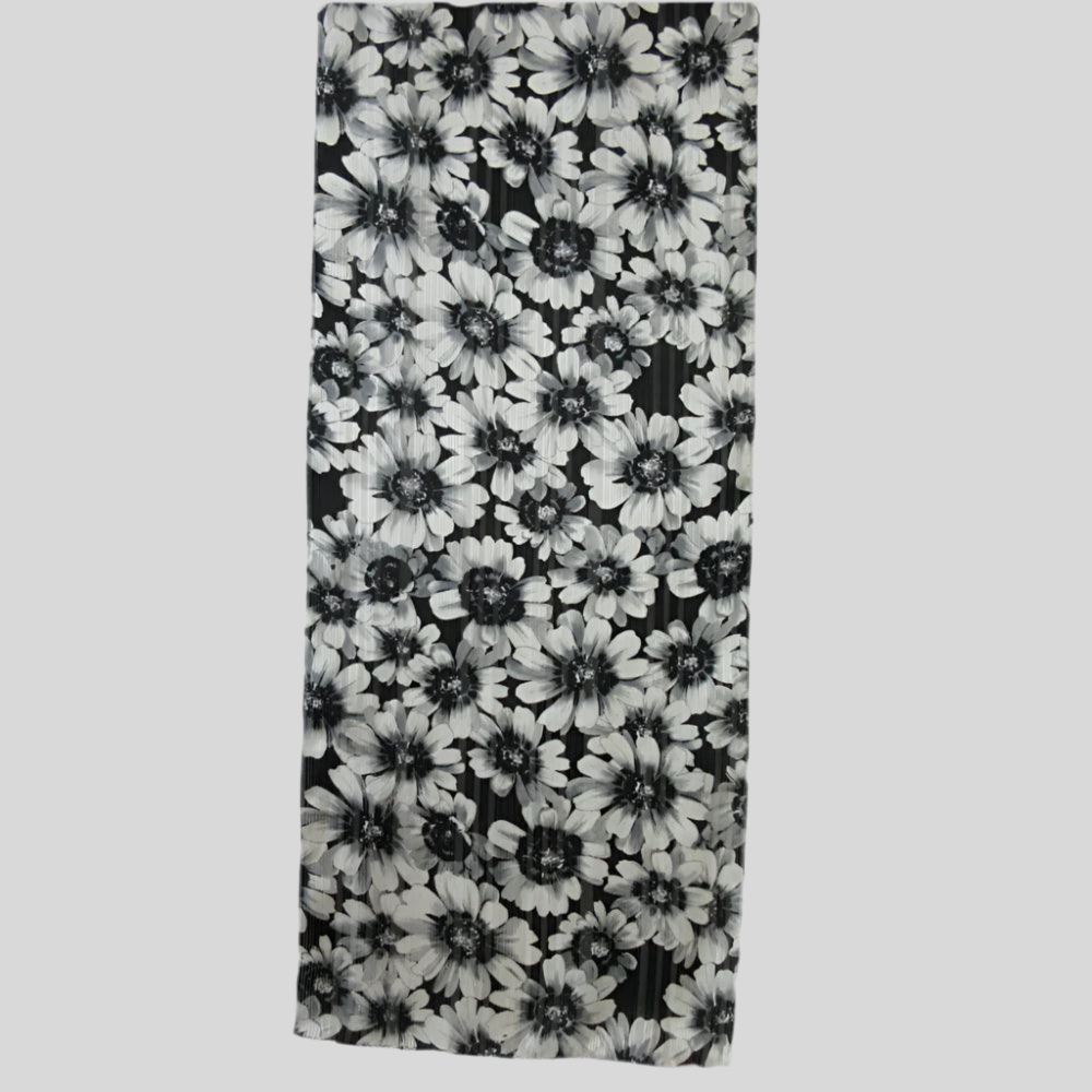 This Echo silk scarf features floral with alternating stripes solid and chiffon and is semi sheer in black, gray, white.