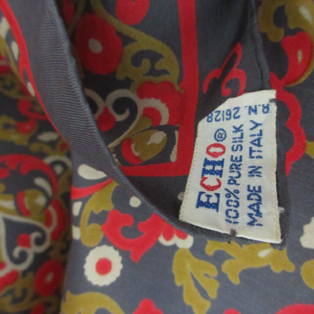 This Echo silk scarf features art abstract vintage pattern in charcoal grey, red, mustard gold, cream.