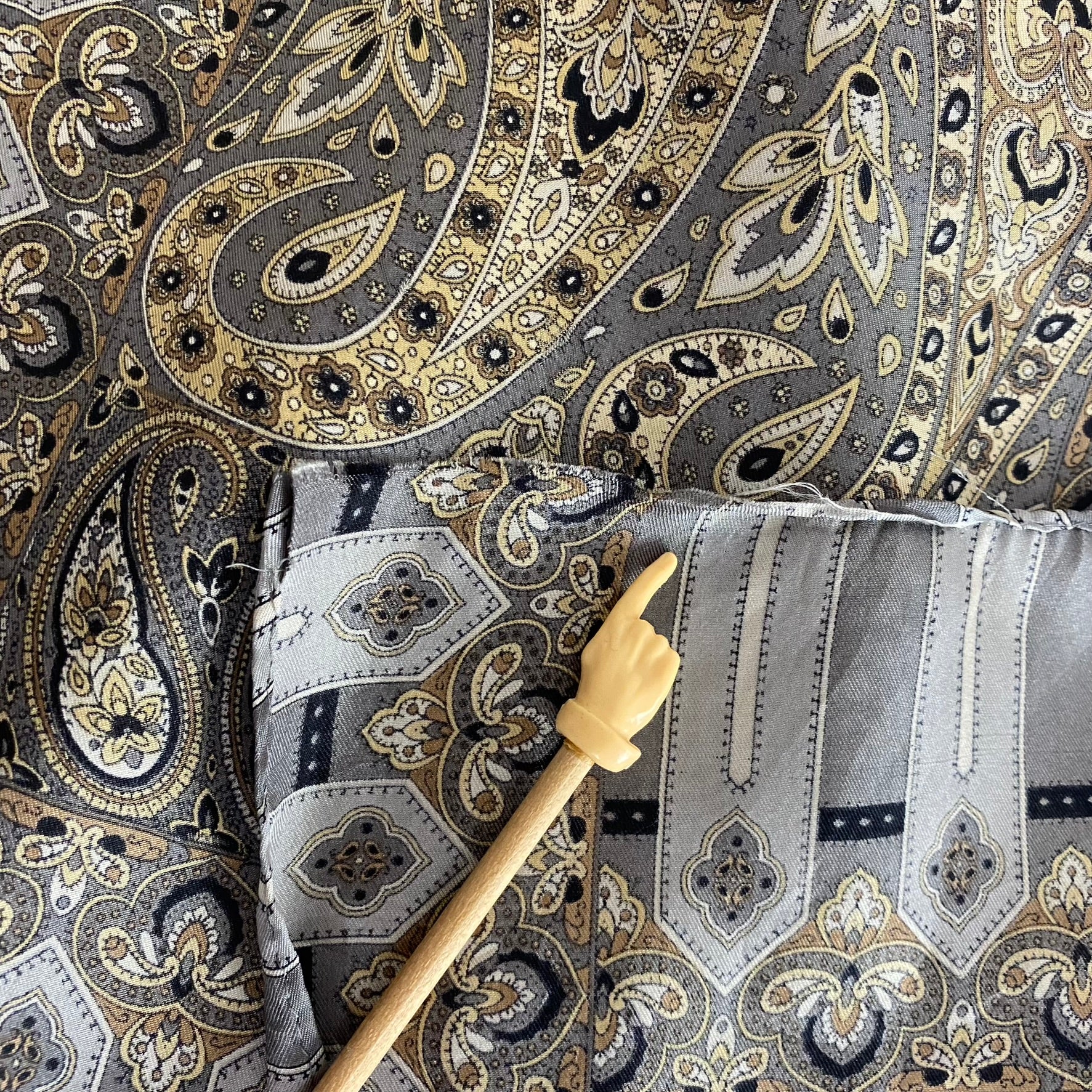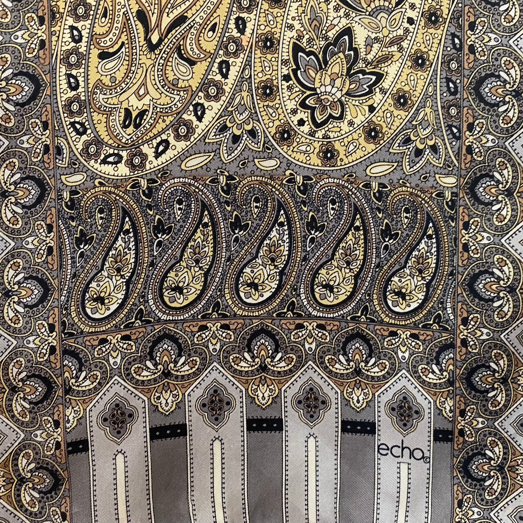 This Echo silk scarf features intricate paisley and floral in silver & charcoal gray, cream, ivory, brown, black.
