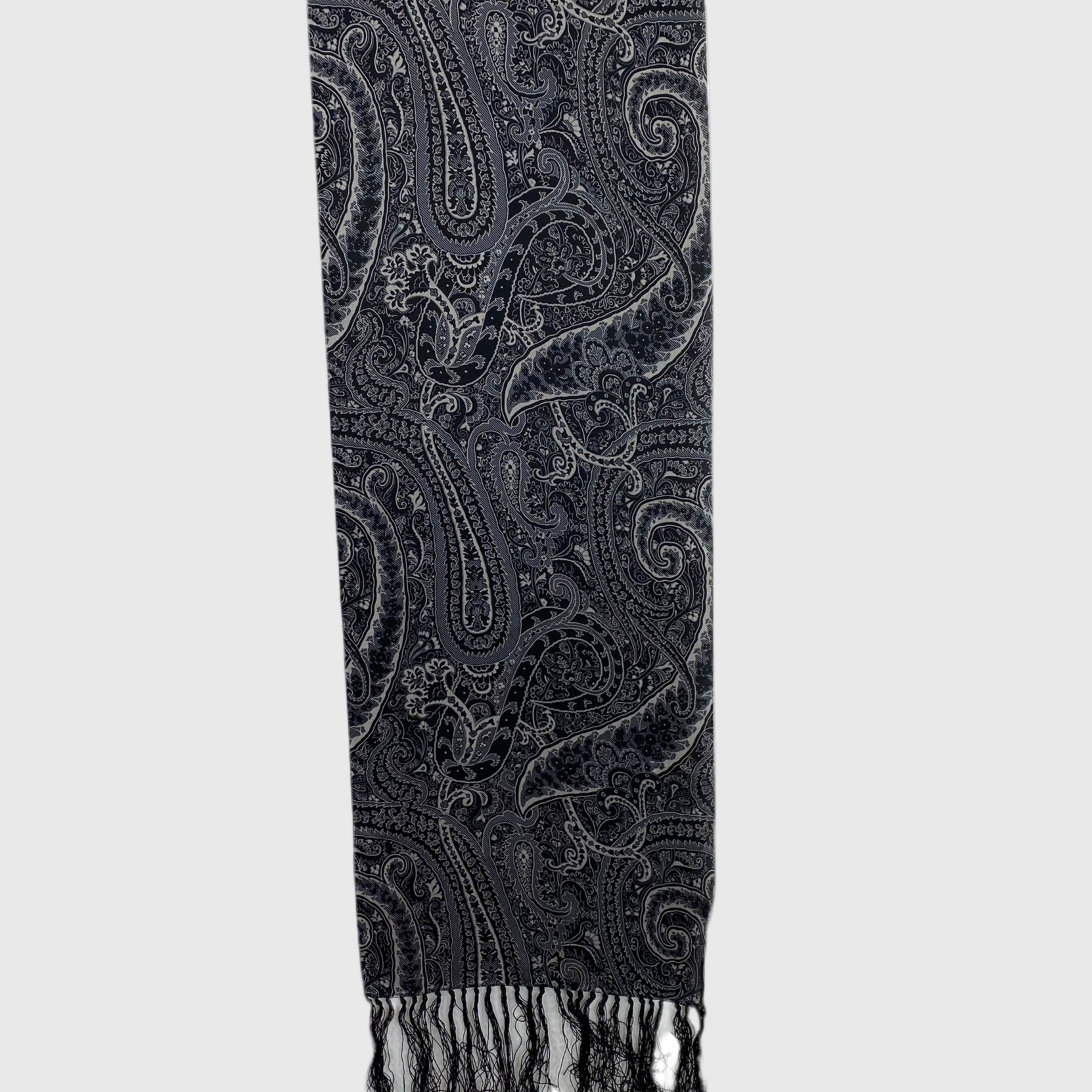 This Echo silk scarf features intricate paisley and floral in black, silver grey.