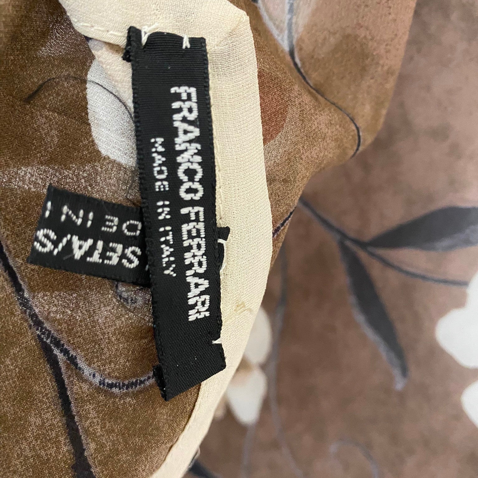 This Franco Ferrari silk scarf features floral design and is lightweight sheer with ribbon border detail in brown, cream, ivory, black.