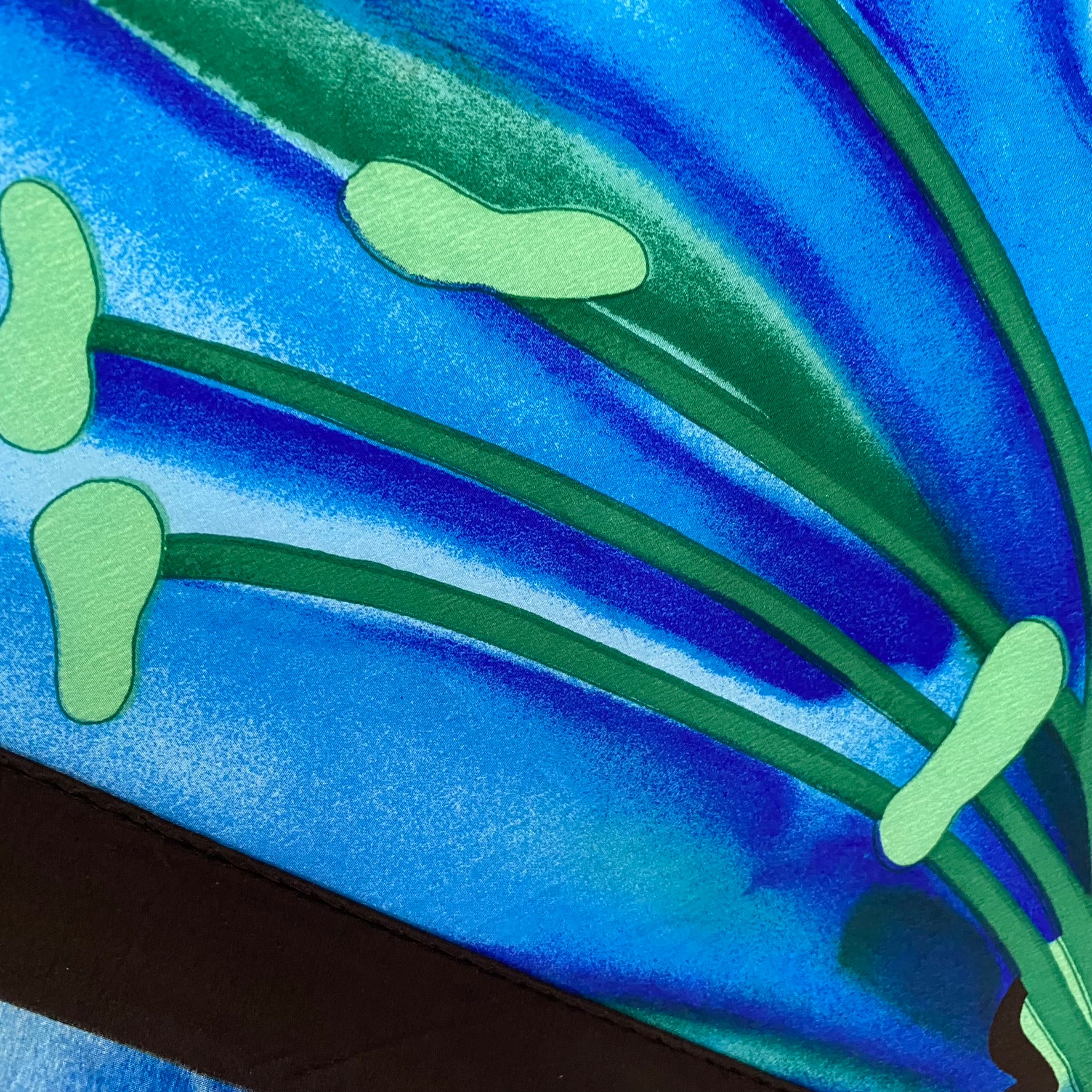 This Ginnie Johansen silk scarf features tropical floral art - black, blue, green, yellow, orange.