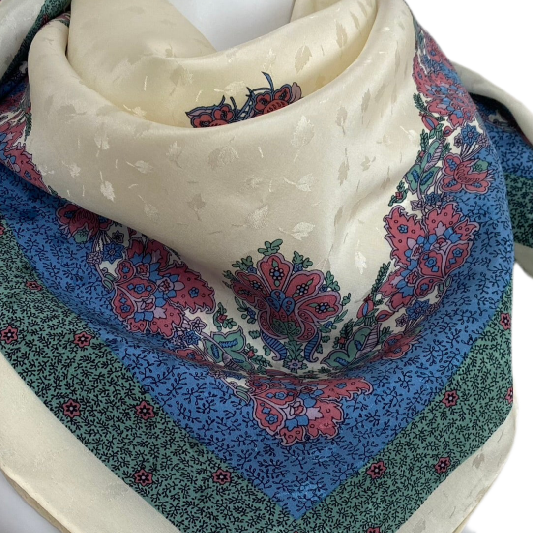 This Ginnie Johansen silk scarf features floral, jacquard pattern in ivory, blue, green, pink, rose, coral.