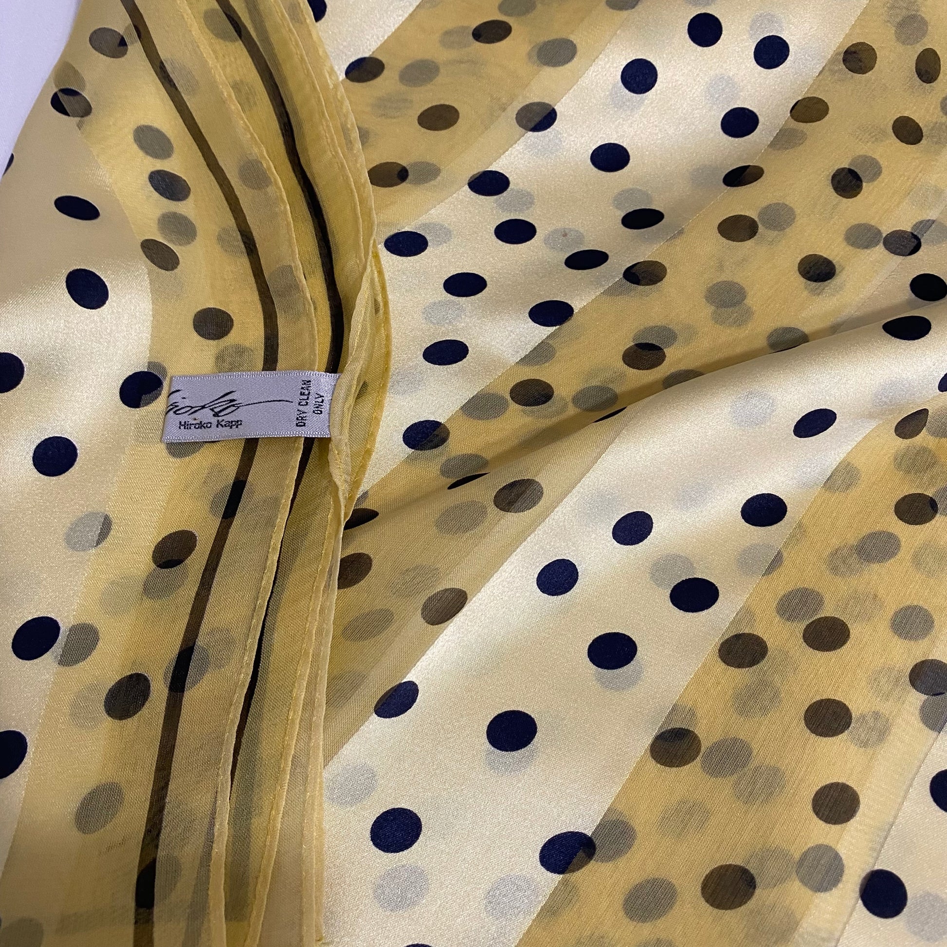 This Hiroko Kapp silk scarf with polka dot design has alternating sheer and solid weave stripes and is lightweight in yellow, black.