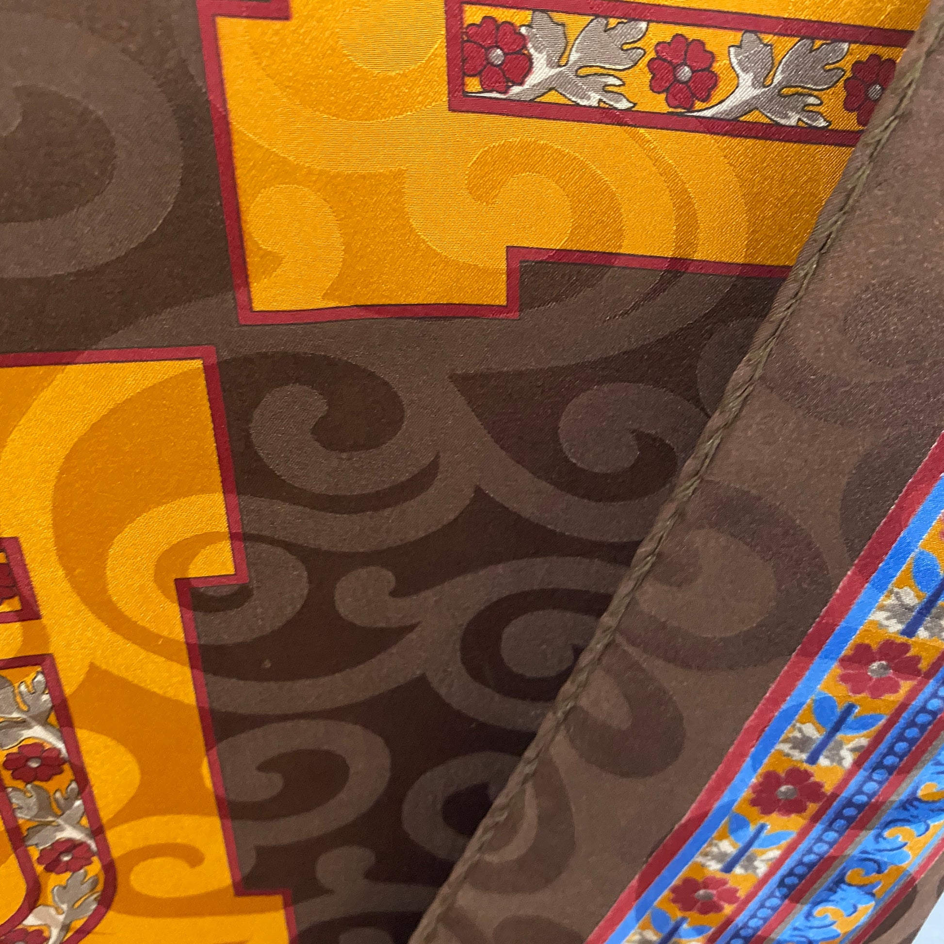 This Laura Biagiotti silk scarf features embossed logo floral design in brown, blue, cranberry, red orange, gold. (color most accurate in first 2 photos)