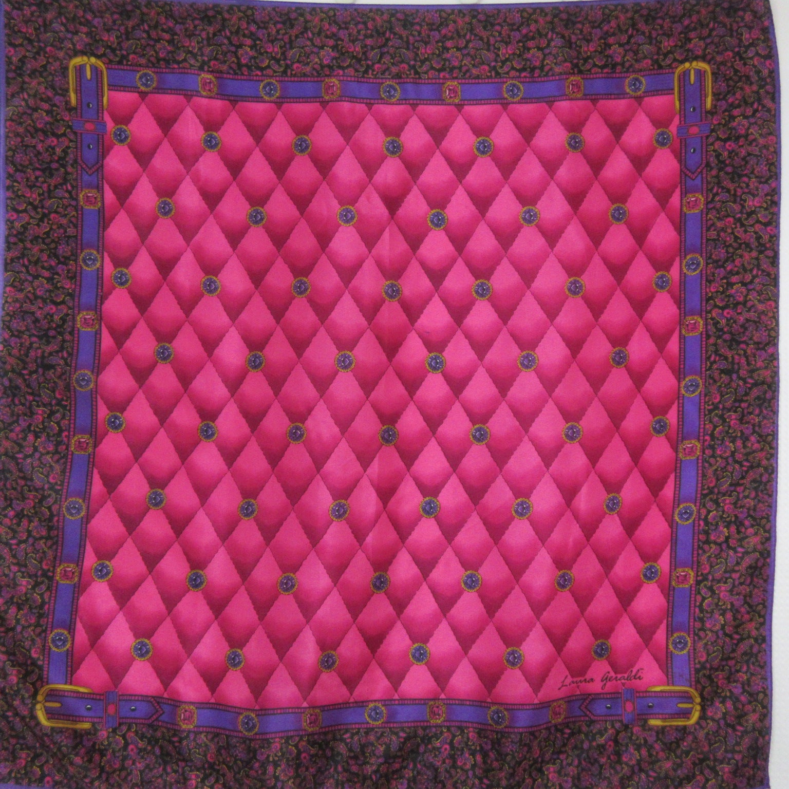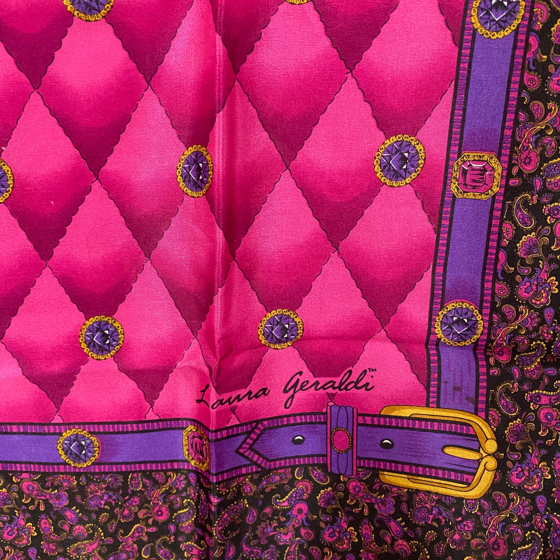 This Laura Geraldi silk scarf features paisley border, jewels in purple, pink, yellow, and gold.