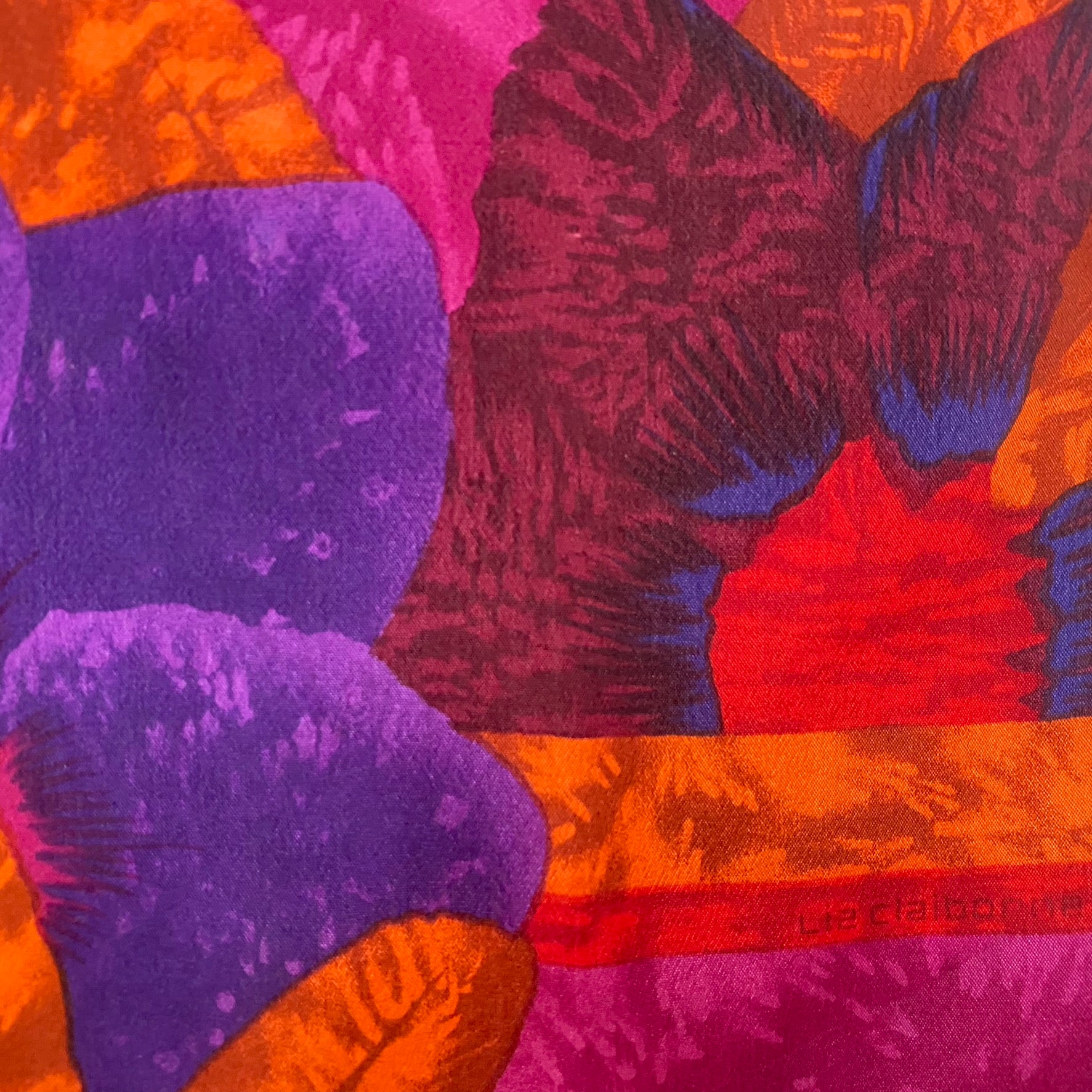 This Liz Claiborne silk scarf feature floral pattern in vivid red, purple, orange, pink, chestnut.