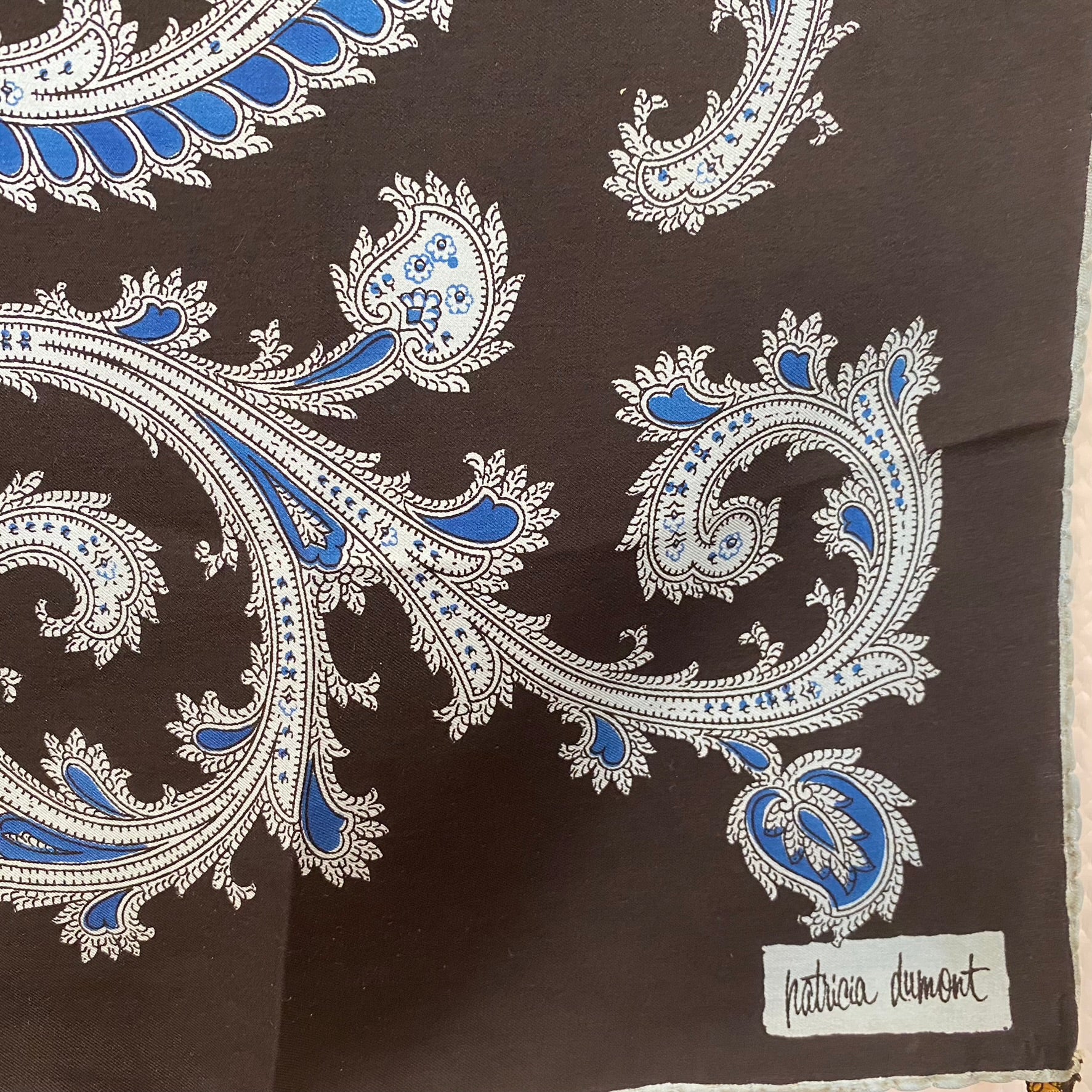 This Patricia Dumont men's silk pocket hankie features paisley intricate vintage design in blue, black.