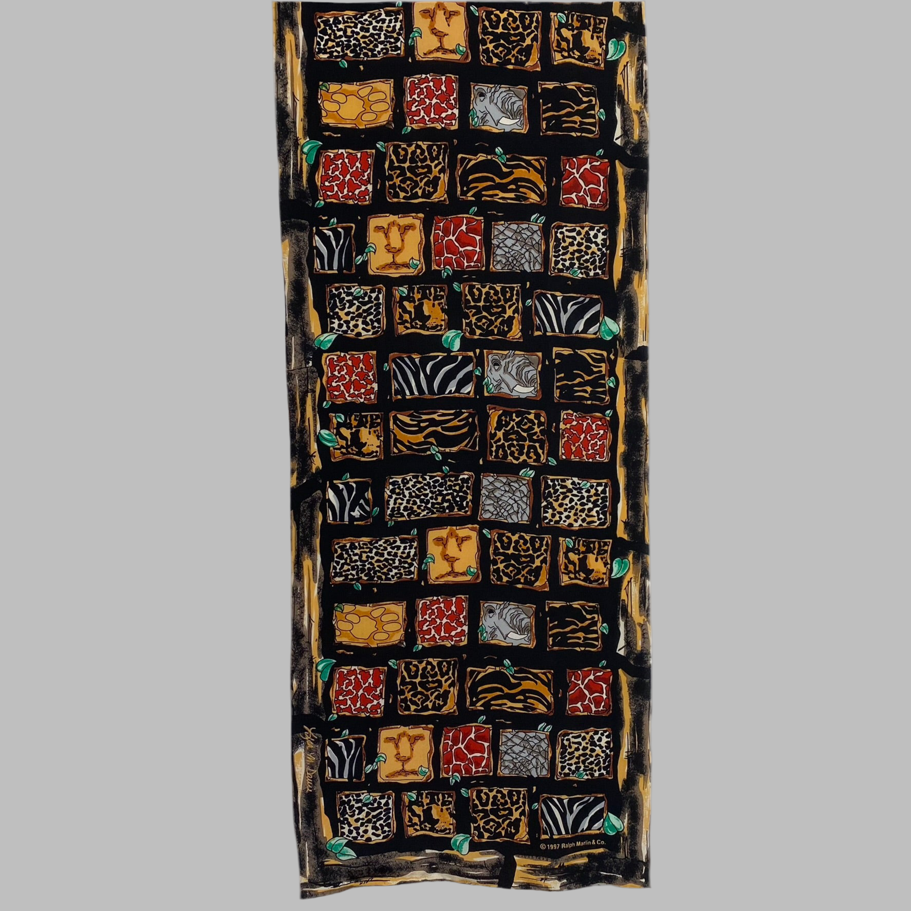 This Ralph Marlin silk scarf features animal print theme signed by Lisa M. Davie in brown, ivory, chestnut, gray, black, green.