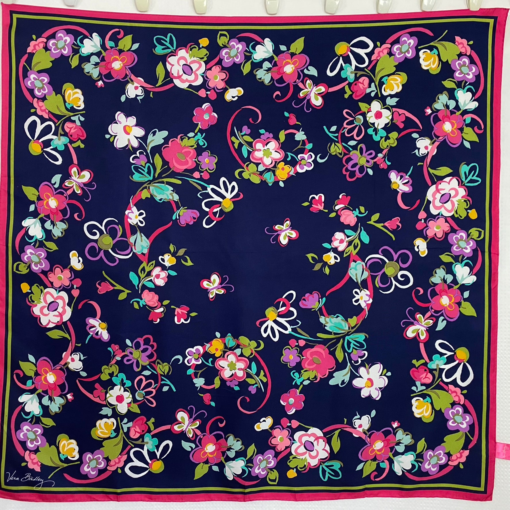 This Vera Bradley silk scarf features floral design in vibrant - pink, navy blue, purple, gold, white, turquoise, green.